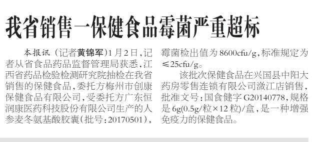 1月2日,记者从省食品药品监督管理局获悉,江西省药品检验检测研究院抽检在我省销售的保健食品,委托方梅州市创康保健食品有限公司,受委托方广东恒润康医药科技股份有限公司生产的人参麦冬氨基酸胶囊(批号:20170501),霉菌检出值为8600cfu/g,标准规定为≤25cfu/g。