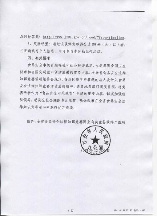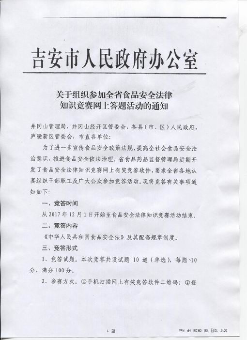 吉安市人民政府办公室关于组织参加全省食品安全法律知识竞赛网上答题活动的通知