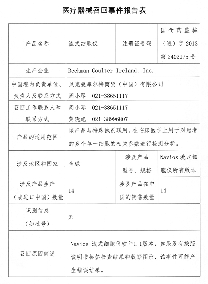 贝克曼库尔特商贸(中国)有限公司报告: 公司发现受影响产品的嵌入式软件存在缺陷。公司主动召回相关产品,召回级别III级。涉及产品的型号、规格及批次等详细信息见《医疗器械召回事件报告表》。