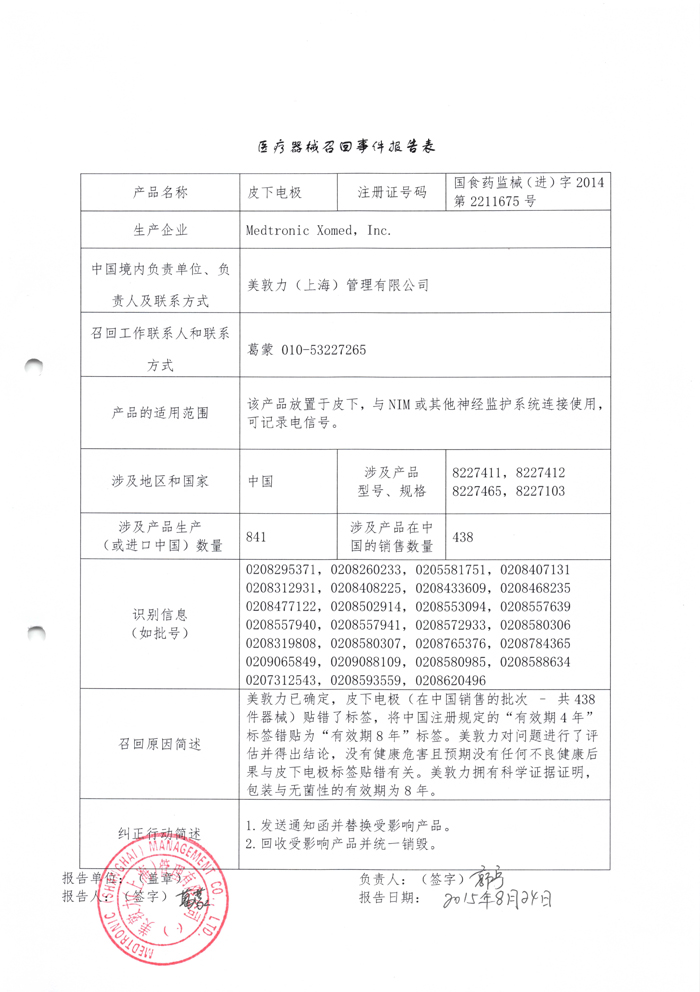 美敦力(上海)管理有限公司报告:公司已确定,皮下电极贴错了标签,将中国注册规定的“有效期4年”误贴为“有效期8年”。Medtronic Xomed Inc.主动召回相关产品,召回级别为III级 。涉及产品的型号、规格及批次等详细信息见《医疗器械召回事件报告表》。