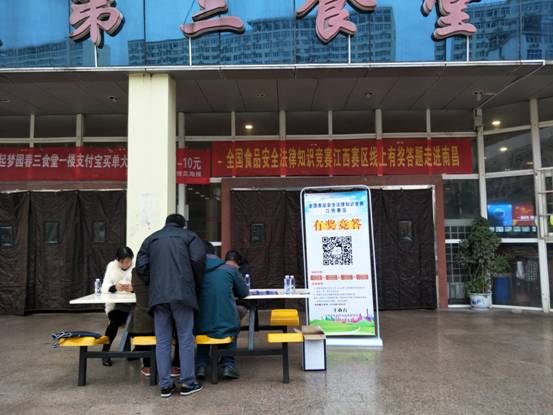 活动中,该局工作人员在南昌大学三食堂和四食堂挂起食品安全法律知识竞赛横幅,在门口放置二维码海报,引导经过的学生参与现场扫描二维码答题,在每个餐桌上都贴有二维码小海报,方便学生扫描答题。食堂工作人员看到门口有普法活动,也纷纷参与其中,扫描二维码答题。