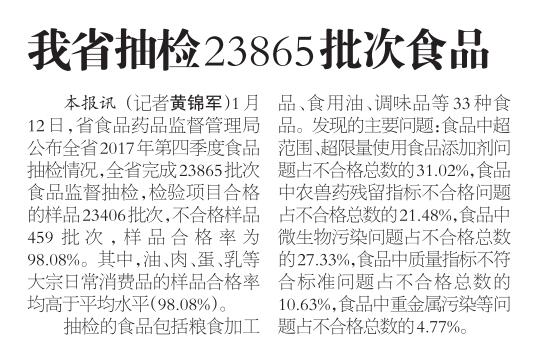1月12日,省食品药品监督管理局公布全省2017年第四季度食品抽检情况,全省完成23865批次食品监督抽检,检验项目合格的样品23406批次,不合格样品459批次,样品合格率为98.08%。其中,油、肉、蛋、乳等大宗日常消费品的样品合格率均高于平均水平(98.08%)。 抽检的食品包括粮食加工品、食用油、调味品等33种食品。发现的主要问题:食品中超范围、超限量使用食品添加剂问题占不合格总数的31.02%,食品中农兽药残留指标不合格问题占不合格总数的21.48%,食品中微生物污染问题占不合格总数的27.33%,食品中质量指标不符合标准问题占不合格总数的10.63%,食品中重金属污染等问题占不合格总数的4.77%。